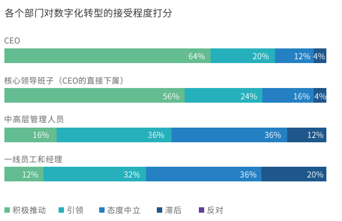 前瞻性和领导力的重要性位居前列,原因在于,数字化转型不仅仅是技术的升级迭代,更是对企业整体战略、商业模式、组织结构的深度影响,因此企业领导人需要具备较为前瞻性的视野,能够充分理解数字化带来的挑战与机遇,并能领导企业做出相应的行动部署。数字化时代与工业时代显著的不同在于,数字化时代的商业面对更具不确定性的外部商业环境,需要企业具备高度的敏锐度以捕捉外部机遇,并以敏捷能力相应对,因此灵活敏捷成为第三项重要特征。最后,以上能力的实现,对企业而言通常会产生巨大的挑战,因此企业领导人需要能够勇于承担风险,以确保上述变革能够落地实施。除了一把手的四大特质尤为重要之外,调研还有一个重要发现是,企业中层对数字化的接受和参与程度,也是影响企业数字化转型成功的重要因素。