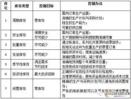 事实上,虽然不是每个企业都会存在所有七种类型的库存,但大部分企业会有其中的数种。同时由于保有库存的目的不同,企业对其进行控制的目标与方法也不尽相同。无论如何,极少有人会将正在由20美元一桶向70美元一桶狂飙的石油库存与那些过期变质的食品库存同样看待。下表是不同类型库存的管理目标与可以采取的控制办法。