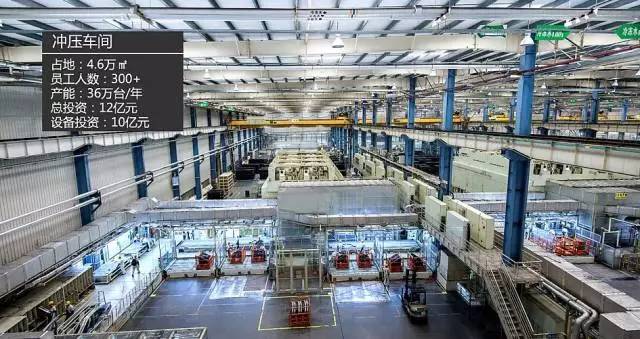 成都工厂的冲压车间面积达1.2万平方米,拥有160T、250T、600T、800T、1200T等多种型号的机械式冲压机,另外还有3000T油压式压机1台,模具304套。
