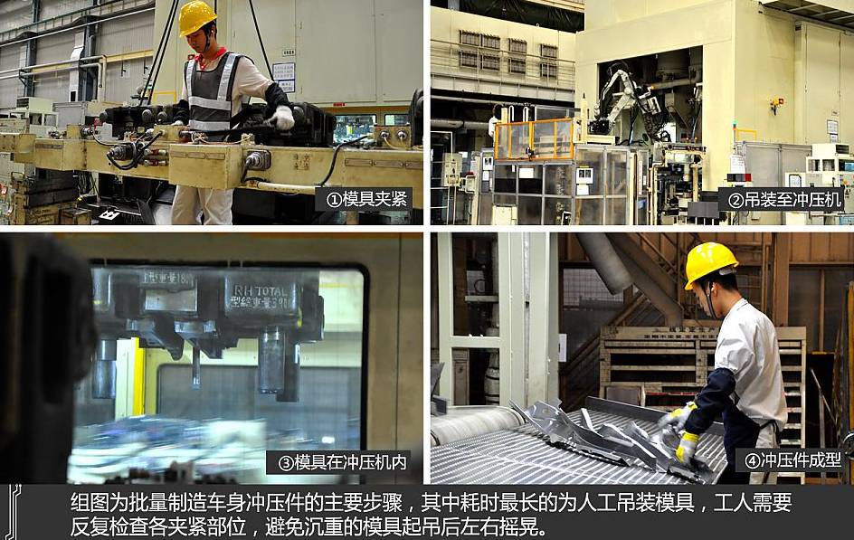 冲压工序就是将钢板投入模具,利用压力机进行拉延、冲孔、修边等工程,加工出普拉多车型的部分金属部件。