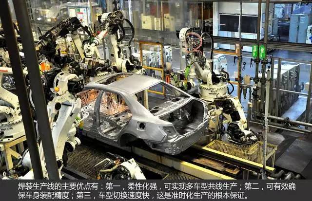 在冲压工序制造出的部品被送入焊接工序。焊接车间的主要工作就是将一个个冲压件组装起来,形成立体的车身结构。