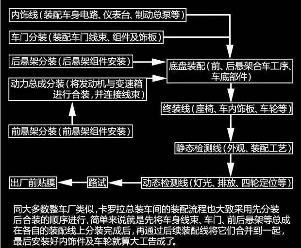 生产线由底盘、前内装线、后内装线构成,并采用辅助装置搭载仪表盘、门、座椅,减轻作业负担。为避免出现漏装误装,全部部品均实行单台送料。再配合各工位的自主检查、线内检查、QC工程管理表抽查等措施。