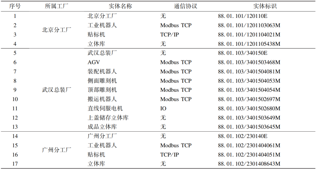 图2 工业互联网标识解析体系结构根据递归解析节点提供的API,在工业互联网平台HolliCube中开发了与其对接的接口,并进行了封装,支撑了与国家顶级节点、二级节点、企业节点的对接,实现了标识注册、解析、查询等功能。2 智能示范产线设计2.1 示范产线整体设计智能示范产线设计以能够展示工业互联网标识解析体系的应用为主旨,同时能够反映工业中的典型新技术新应用,包含数字孪生、缺陷检测、个性化定制等。构建好的智能示范产线实施效果如图3所示,其主要实体信息见表1。由表1可见,组装完成后的产品原型,由底座、立方体、上盖组成;智能工厂包含北京分工厂、广州分工厂、武汉总装厂,其中北京分工厂生产底座,广州工厂生产立方体,武汉总装厂生产上盖并负责成品的组装和入库;AGV负责产品的转运,将北京分工厂、广州分工厂的部件产品运输到武汉总装厂。