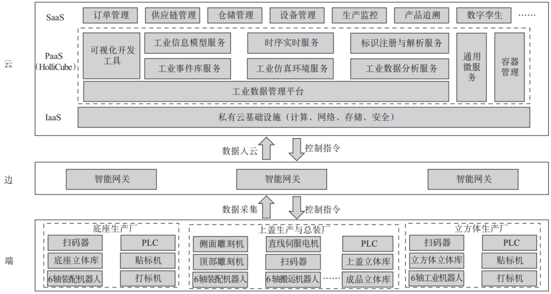 如图1所示,基于工业互联网平台标识解析体系的应用采用云边端一体化架构,端侧包含3个工厂生产设备、辅助设备、可编程逻辑控制器(Program Logic Control,PLC)系统等,详情见第2章的智能示范产线设计;边缘侧为在生产现场部署的智能网关,支持有线传输、无线传输,能够通过将Modbus TCP等几十种工业协议转换成MQTT,实现现场设备的数据采集,并入云到私有云平台数据管理中心,另外支持云端控制指令的下行和需要实时处理的计算;云端分为3层,其中IaaS层由私有服务云搭建,PaaS层是工业互联网的核心,为SaaS层提供应用开发支撑,SaaS层为具体的业务应用层。