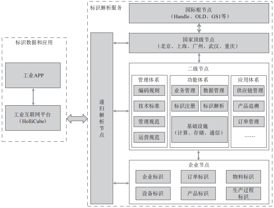 图1 基于工业互联网平台标识解析体系的应用框架1.2 工业互联网平台工业互联网是互联网和新一代信息技术与工业系统全方位深度融合所形成的产业和应用生态,是工业智能化发展的关键综合信息基础设施。其本质是以机器、原材料、控制系统、信息系统、产品以及人之间的网络互联为基础,通过对工业数据的全面深度感知、实时传输交换、快速计算处理和高级建模分析,实现智能控制、运营优化和生产组织方式变革[3]。本文介绍的这款由企业自主研发的工业互联网平台HolliCube,参照了工业互联网产业联盟发布的工业互联网体系架构2.0,采用了Kubernetes、Docker、Service Mesh等容器管理、微服务技术。HolliCube由通用平台层、工业PaaS层和可视化工具构成,其中通用平台层由工业数据管理、通用微服务、容器管理搭建而成;工业PaaS层提供工业信息服务,采用工业微服务部署形式,可满足不同企业因生产差异产生的功能需求,包含工业信息模型服务、工业事件库服务、工业仿真环境服务、标识注册与解析服务、工业数据分析服务等;可视化开发工具层基于HTML5技术,提供B/S的工业信息模型建模工具、可视化应用开发工具与管理控制台。HolliCube支持云边端协同业务模式,以平台+APP方式提供灵活、可扩展的业务功能,通过云平台中标识体系的服务,提供订单管理、供应链管理、仓储管理、产品追溯、数字孪生等标识注册与解析相关的APP应用。1.3 标识解析体系工业互联网标识解析是指为工业制造中的智能机器、生产设备、零部件、存储系统等赋予唯一标识,建立基于标识的通信网络,实现所有元素全面互联以及相关信息的获取、处理、传输和交换,从而为制造业深层次的应用提供数据资源的过程[4]。基于工业互联网标识解析体系架构的产业应用本质上区别于传统互联网模式下的信息系统应用,它是一种实现跨主体、跨环节、跨应用的行业信息系统集成应用模式。如图2所示,工业互联网标识解析体系采用分层、分级模式构建,由国际根节点、国家顶级节点、二级节点、企业节点、公共递归解析节点等要素组成,其中二级节点是指一个行业或者区域内部的标识解析公共服务节点,能够实现异构标识体系的互联互通,支撑工业互联网平台开展资源定位和信息共享,具备备案、监测、认证等保障能力[5]。