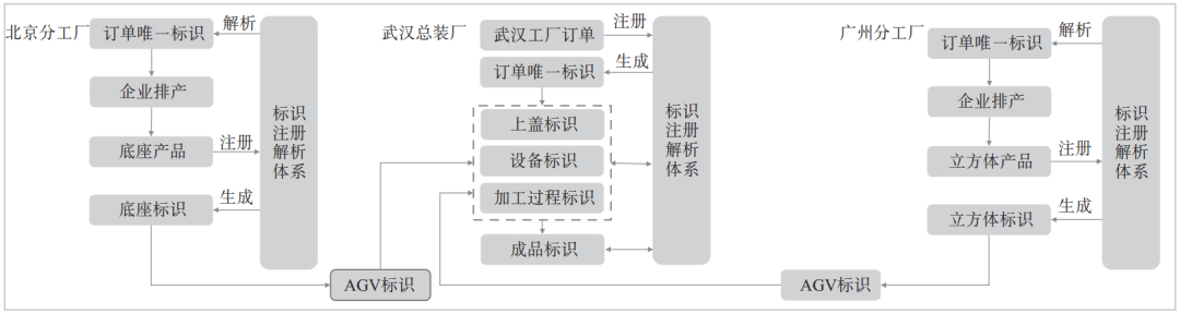 2.2 标识解析体系应用图4所示为智能示范产线标识注册解析流程。当人脸识别终端产生订单后,工业互联网平台上的订单系统会对订单进行分解,并在标识注册解析系统进行注册,生成订单唯一标识,北京分工厂、广州分工厂按照订单要求生产底座、立方体,并注册生成产品的唯一标识,通过贴标机将唯一标识码贴在产品上面;武汉总装厂根据订单生产上盖,当底座、立方体库存低于生产需要时,AGV会到分工厂运输缺少的部件产品,并在总装厂组装位将三者组装成成品,然后由侧面雕刻机雕写个性化定制的内容,顶部雕刻机雕写成品的唯一标识码,最后通过搬运机器人实现入库。另外,在成品入库前,工业相机会对成品进行缺陷检测,检测标准包含颜色色差、配合紧密度,最后按照不同类别分类存放。