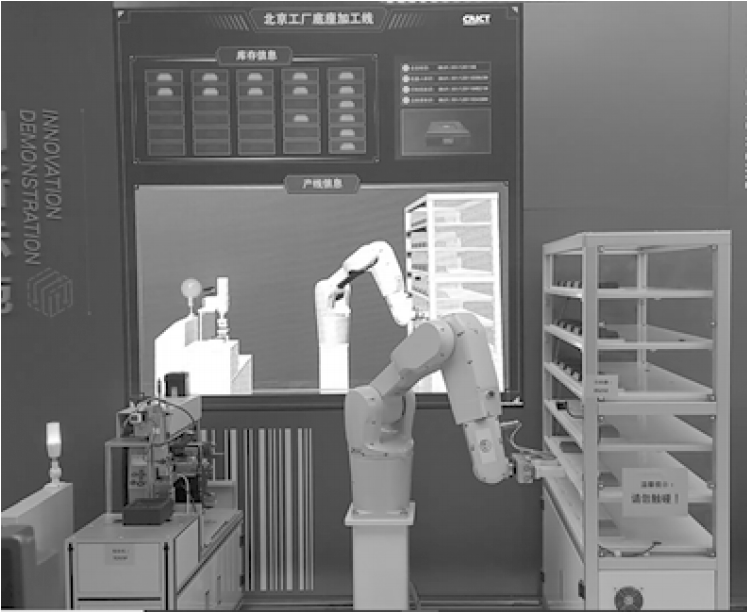 图4 智能示范产线标识注册解析流程2.3 数字孪生系统数字孪生是以数字化方式创建物理实体的虚拟模型,借助数据模拟物理实体在现实环境中的行为,通过虚实交互反馈、数据融合分析、决策迭代优化等手段,为物理实体增加或扩展新的能力[6]。从根本上讲,数字孪生可以定义为有助于优化业务绩效的物理对象或过程的历史和当前行为的不断发展的数字资料。数字孪生模型基于跨一系列维度的大规模、累计、实时、真实世界的数据测量。数字孪生具有的典型特征包含互操作性、可扩展性、实时性、保真性、闭环性[7]。在智能示范产线中3个工厂处分别设置3块大屏幕用于数字孪生的展示和应用,包含虚实映射、反向控制调试。(1)虚实映射的展示:在操作控制台设定智能示范产线为自动模式,大屏幕上虚拟工业机器人的运动、贴标机的状态指示灯与机械动作、立体仓库存储状况(产品与原料存储位置、产品的标识信息)、AGV运动等,是由对应实体的实时数据驱动进行变化的,经过测试其中工业机器人的虚实映射时延在50 ms以内,具体现场效果如图5所示。