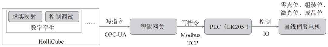 (2)反向控制调试的流程:在操作控制台将智能示范产线由自动模式切换到手动模式,在工业机器人控制柜将其运行模式切换到手动模式,通过在Hollicube上定制开发的Web程序,设定只有管理员账号的访问控制权限,实现远程模拟与调试4台工业机器人,确定合适的逻辑程序后下载到工业机器人。直线伺服电机的远程控制调试逻辑如图6所示。另外,大屏幕上展示的数字孪生效果的上半部分展示了立体库的原材料和加工完成的产品,每个产品可以详细查看其标识信息和生产过程信息。