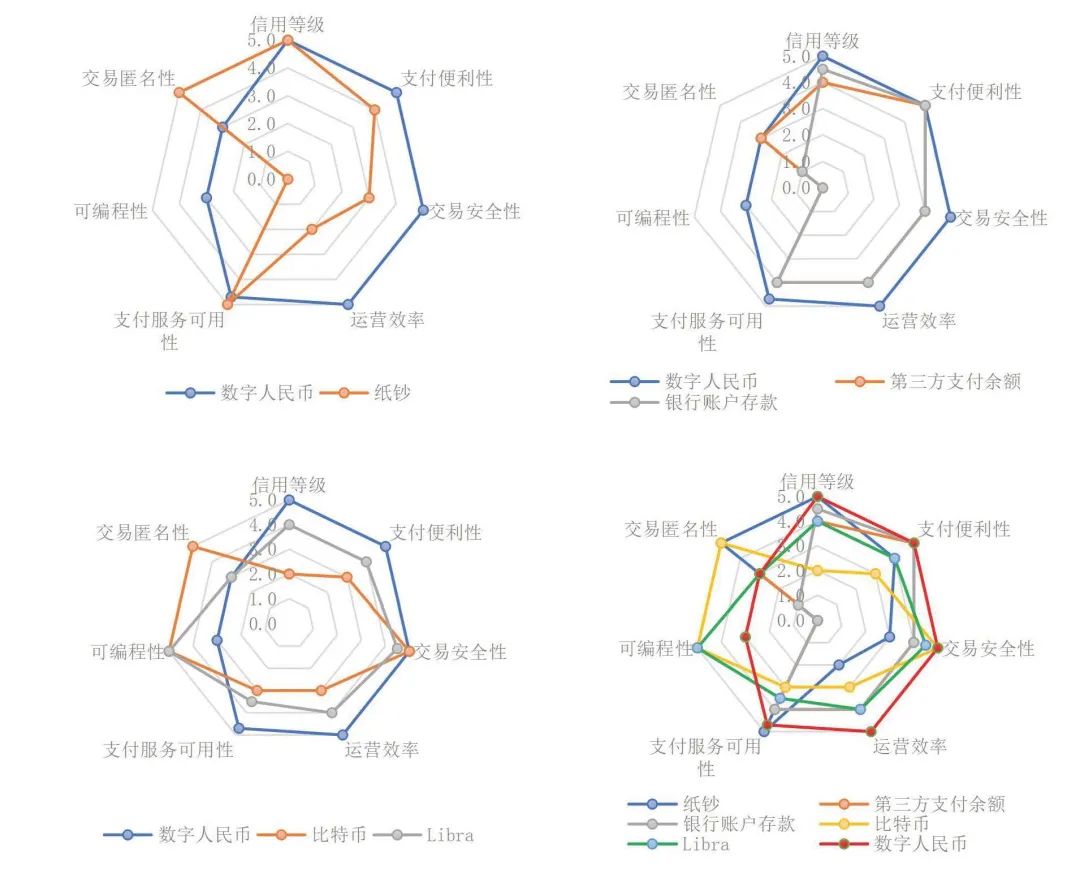 资料来源:01区块链,零壹智库而参考美联储和中国人民大学金融科技研究所的研究,可以从运营效率、支付便利性、匿名性等7个维度对各支付方式进行量化评估,如下表所示(各项满分为5分)。表3:数字人民币与其他支付方式的对比