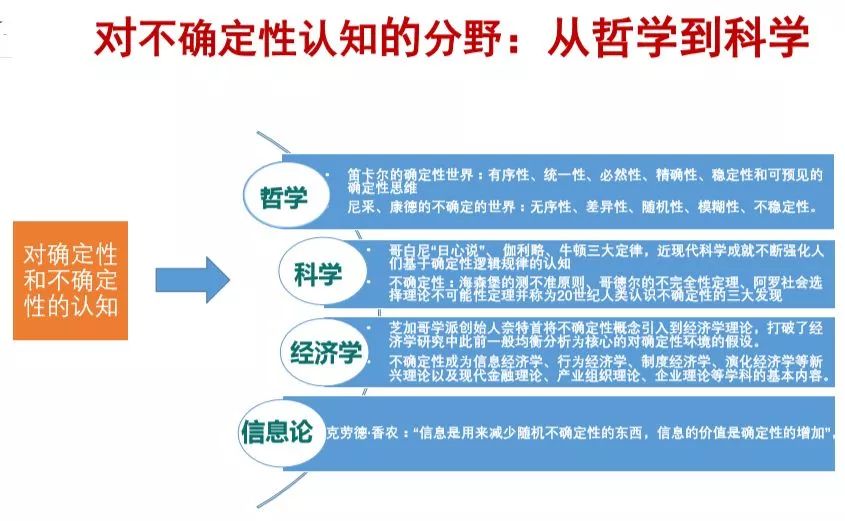 化解不确定性的“三部曲”。第一,理解和认知世界运行的规律,是化解不确定性的逻辑起点;第二,理解运行规律之后需要预测将会发生什么,这是决策的基础和依据;第三是控制,是将决策付诸行动的具体路径。
