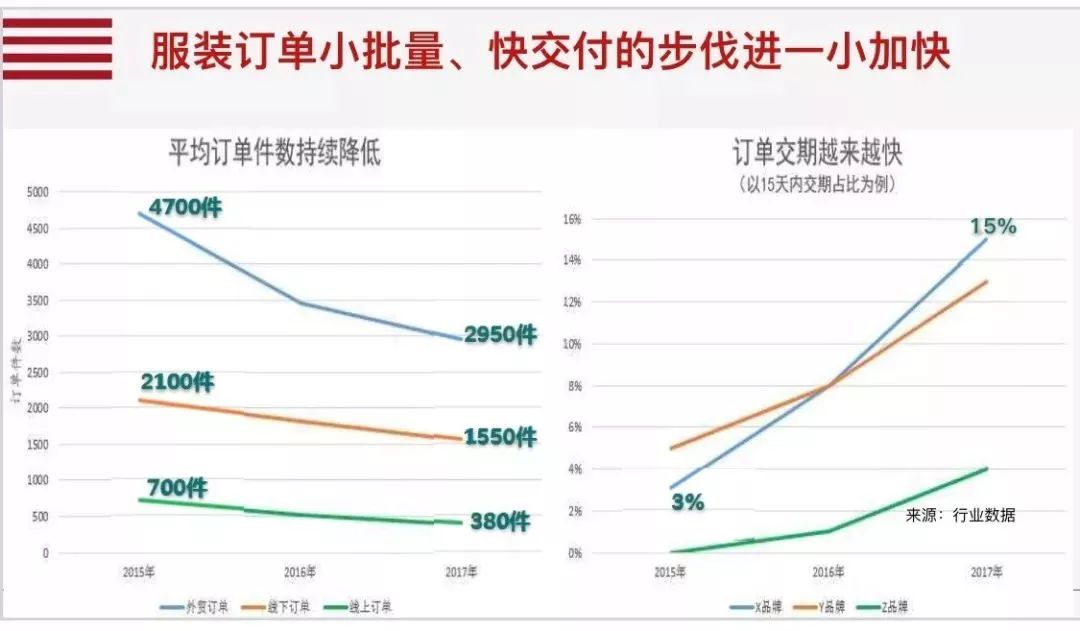 中国是全球最大的服装出口基地,过去一个外贸服装订单量可以达到百万级,后来订单量下降到了十万、五万级,今天服装的外贸订单最小批量只有3000件左右,线下订单达到1500件、线上达到380件。但同时,订单的交期从过去的一年、半年、三个月进一步压缩到15天,有些品牌厂商15天交期产品的比重已占所有产品的15%。而具备15天交期能力的代工厂,其单件产品的议价能力比大规模生产厂家高出30%。对于智能制造和数字化转型而言,其要解决的核心问题是如何解决小批量、多品种、短交期的问题。