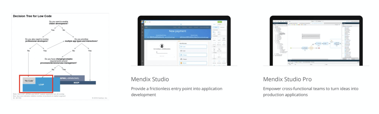 虽然零代码与狭义上的低代码有着上述明显差异,但从广义上来说,零代码可以当作低代码的一个子集。Gartner在其相关调研报告中,就是将“No Code”划在了范围更广的低代码应用平台“LCAP”(Low-Code Application Platform)中。而当前市面上很多通用的低代码开发平台,也都兼具一定程度的零代码能力;比如低代码领域领头羊Mendix,既提供了简单易用的零代码Web IDE - Mendix Studio,也包括一个功能更强大的低代码桌面IDE - Mendix Studio Pro。