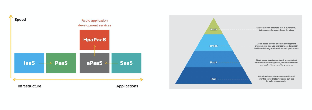 图源:https://blog.kintone.com/business-with-heart/difference-saas-iaas-paas-apaas-hpapaas值得补充的是,“HpaPaaS“这个词也并非横空出世,而是传承自更早之前Gartner提出的“aPaaS”,它俩之间的关系是:HpaPaaS只是aPaaS的一个子类;除了HpaPaaS这种通过低代码实现的高生产力应用开发平台以外,aPaaS还包括面向纯代码的传统应用开发平台(High-control aPaaS,即可控度更高的纯代码开发方式)。不值得但就想八卦一下的是,“aPaaS”这个词也非凭空捏造,而是与云计算的兴起渊源颇深。相信各位云道中人都已猜到,aPaaS与IaaS/PaaS/SaaS这些云计算远古概念是一脉相承的:aPaaS介于PaaS和SaaS之间,相比PaaS提供的服务更偏应用,但又不像SaaS一样提供现成的软件服务(更详细的说明可参考配图来源文章)。