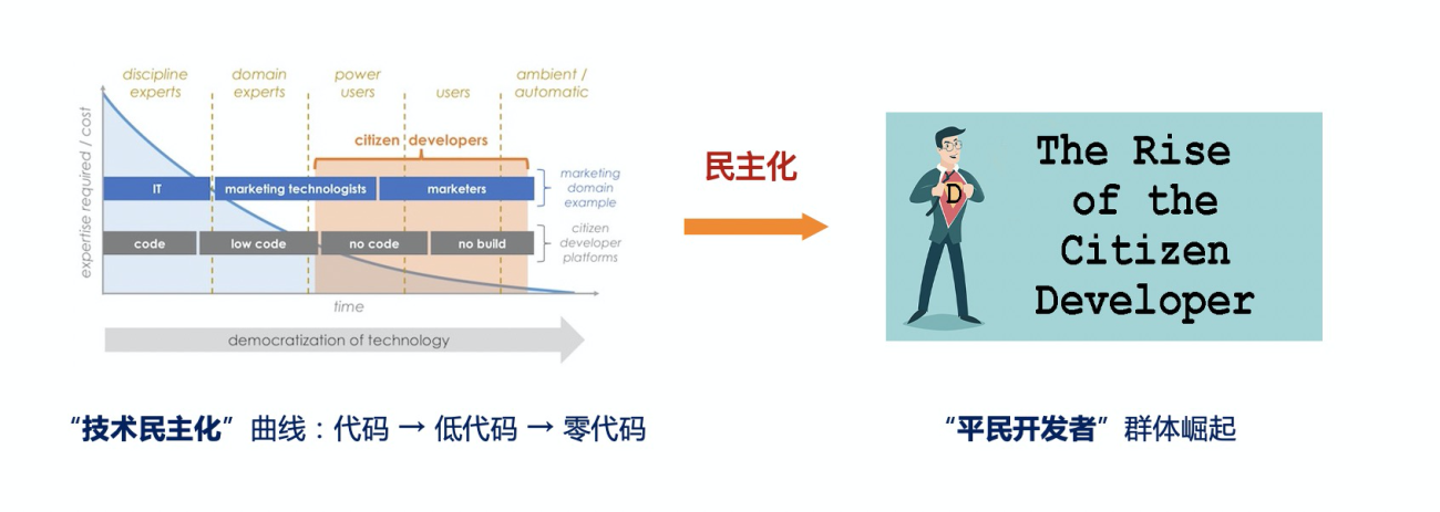 至此,应用开发能力不再是少数专业开发者的专利和特权,且今后所需要的技能门槛与拥有成本也会越来越低,真正实现所谓的“技术民主化”(democratization of technology)。
