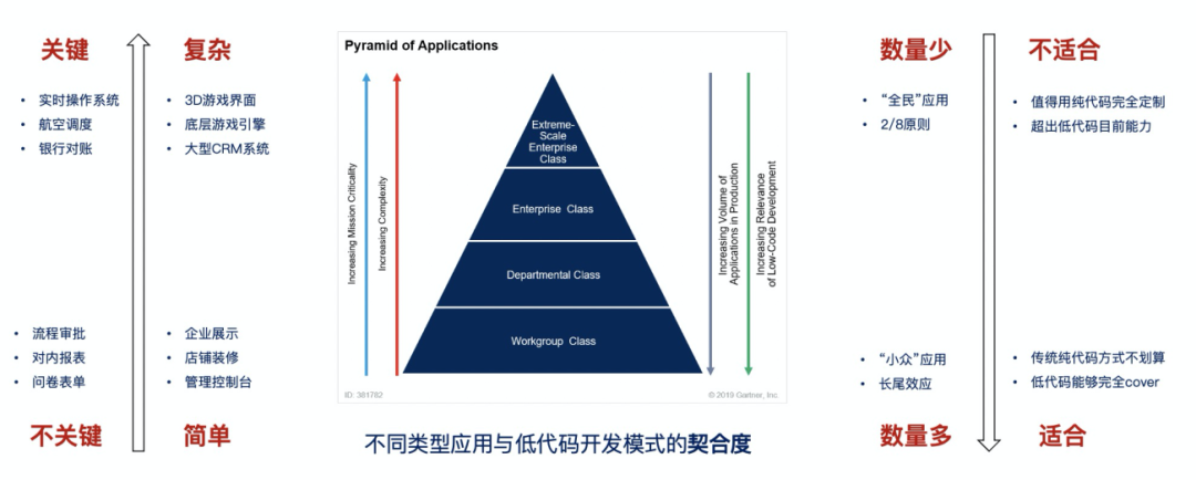 理论上来说,低代码是完全对标传统纯代码的通用开发模式,应该有能力支撑所有可能的业务场景。但理论也只是理论,低代码一统江湖的梦想尚未照进现实,也不可能完全取代现实。前文中提到过,低代码与纯代码方式是互补关系,未来也将长期共存,各自在其所适合的业务场景中发光发热。同时还需要指出的是,当前阶段的低代码技术、产品和市场都尚未完全成熟,因此部分本来可能很适合用低代码来开发的场景,目前也只能先用纯代码来替代。Gartner在2019年的低代码调研报告中,曾经绘制过一张用来阐述低代码适用场景的“应用金字塔”: