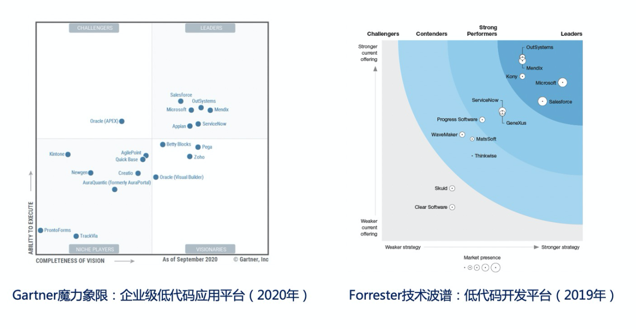 上图分别是Gartner给出的低代码平台魔力象限和Forrester给出的低代码平台技术波谱。从图中可以看到: