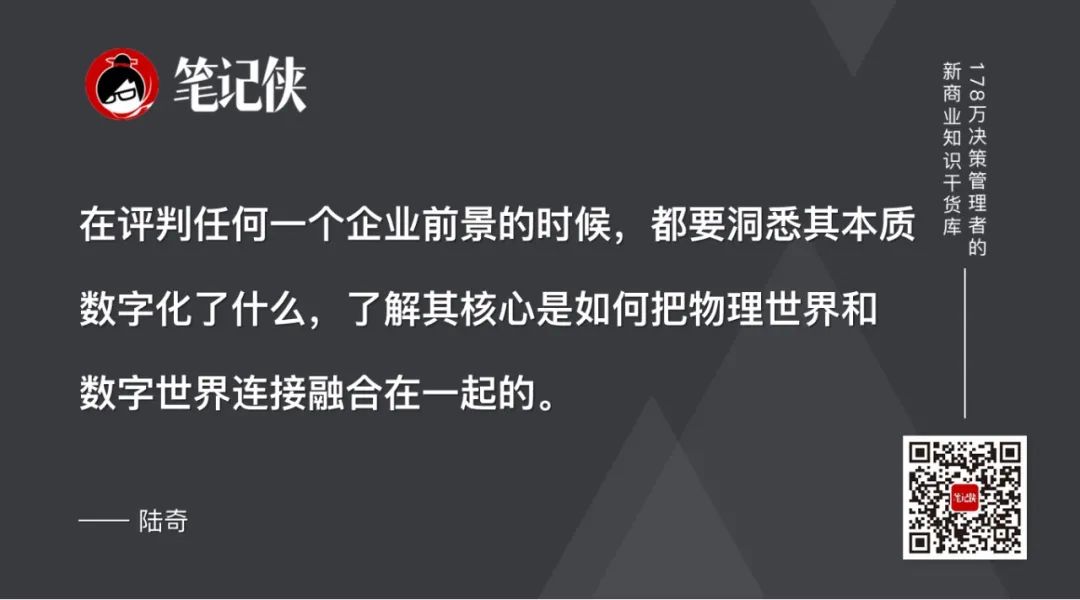 在评判任何一个企业前景的时候,都要洞悉其本质数字化了什么,了解其核心是如何把物理世界和数字世界连接融合在一起的。