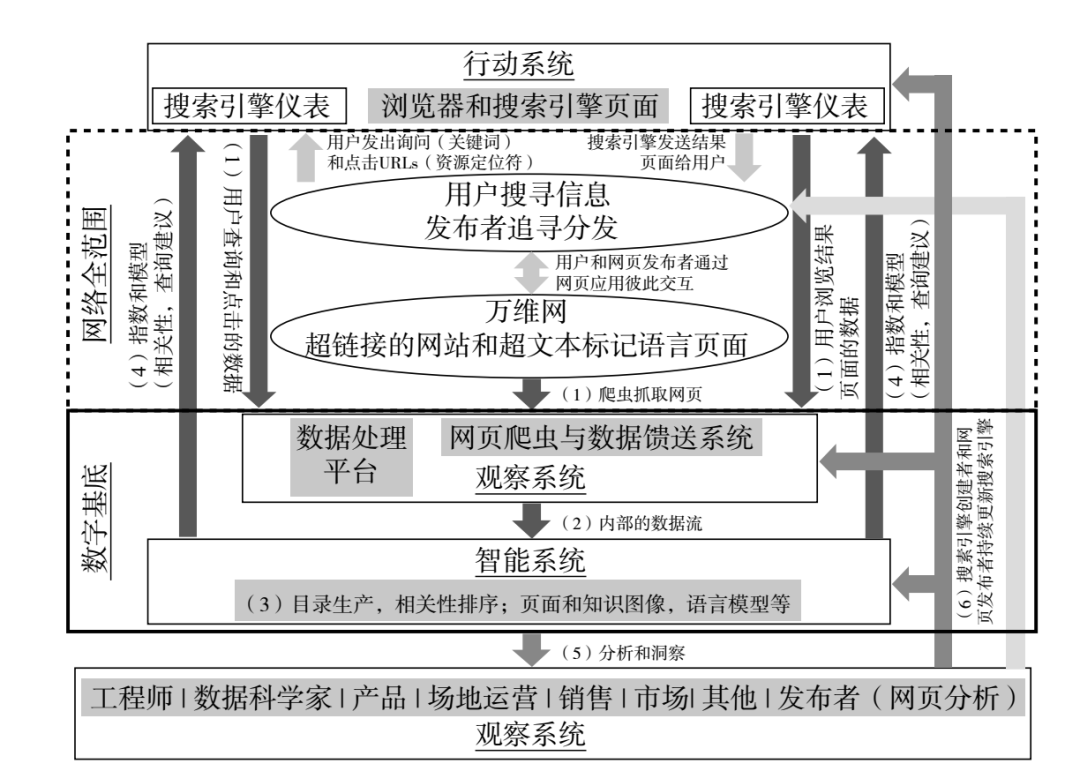 在这个信息聚合体系底层的是“数字化基底”(Digital Substrate),这是一个集成的数据系统,无论是某个搜索引擎,还是某个社交平台,其信息架构都是这样的。重点在于这是一个公开的信息架构,它清楚地勾勒出某个社会现象的数字化流程和闭环结构。只有形成闭环的社会现象,才能具备自动自我迭代、进化演变的智能能力。其内在一定有以下几个子系统。