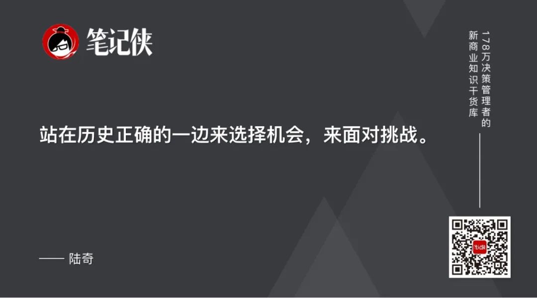 但我特别想与诸位分享我认为特别重要,也特别有意义的态度,就是“Be on the right side of history”(站在历史正确的一边)来选择机会,来面对挑战。