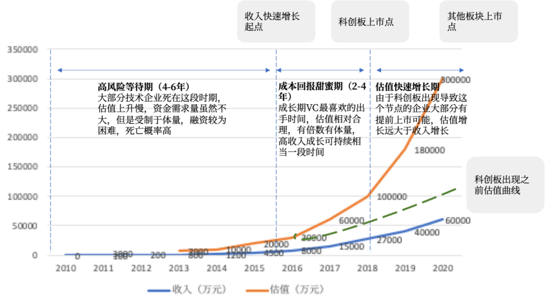 不适用的互联网投资模式不同于互联网行业,技术和制造业有其自身的自然发展规律。首先,从投资到退出的时间周期不同。互联网是VC投资的肇始,投资可以快进快出,因为互联网企业的成长相对迅速,投资后能顺利成长的企业三五年后就可以实现上市,长不大的企业两三年也走到尽头了。反观技术和制造业企业,完成同样的时间周期很可能是互联网企业的两倍。目前在A股上市的此类公司,在没有科创板之前,从成立到上市的平均周期是12年;科创板推出后,虽然最快有5~6年上市的案例,但大多数仍需要8~10年的时间。随着科创板上市节奏的成熟,技术和制造业企业8~10年走到上市会是一个更普遍的现象。而在一支VC基金通常十年甚至更短的存续期内,如果是从事早期投资的,意味着哪怕是在基金成立的第一天即投资一家技术企业,到企业上市、锁定期解除,大概率已经在10年以上了,更不用说在基金投资期后期投资的企业。