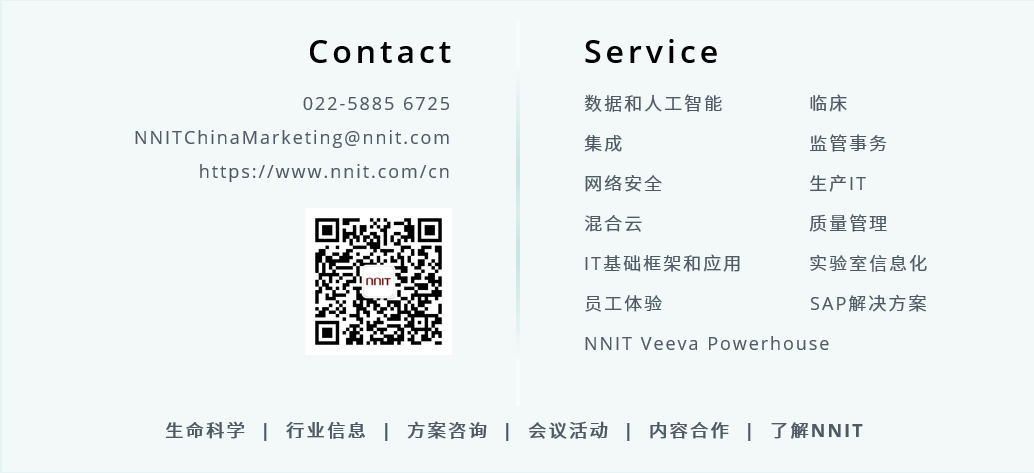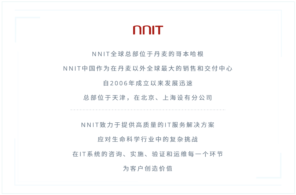NNIT作为一家专注于生命科学领域的IT服务供应商,致力于为客户提供安全合规的IT服务和成熟高效的解决方案,拥有医药行业深受信赖的顾问团队,能够帮助行业客户深化数字化转型。NNIT积累了丰富的行业经验,在药物研发、生产和流通的各个阶段,均能提供安全合规且贴合客户需求的信息化解决方案咨询、实施、验证和运维服务。