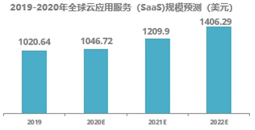 云计算自2006年提出至今,经历了突飞猛进的十年,全球云计算市场规模增长数倍。公开数据显示:2019年,以IaaS、PaaS和SaaS为代表的全球云计算市场规模达到1883亿美元,增速20.86%;预计到2023年的市场规模将超过3500亿美元,未来几年的平均增长率在18%左右。其中,SaaS是云计算最大的细分市场,全球市场规模达到1020亿美元,中国市场也达到194亿元人民币。