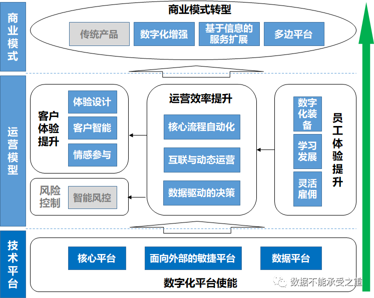 按照企业架构的理论框架,要创建一家企业,首先要回答的就是商业模式的问题。无论是在企业老板脑子里,还是在商业计划书里。通过数字化的转型,企业将向客户提供跟自己现有产品不一样的产品/服务。作者给出了三类常见的新产品/服务:1)数字化增强:例如由产品销售变为租赁,按使用进行收费。例如,华为面向企业客户,以前主要服务器、网络等硬件产品,现在转为向客户提供云服务,也属于这一类型。2) 基于信息的服务扩展:在通过已有产品上增加数字化模块,让产品变得更智能,进一步提供增值服务。例如由传统的体重秤转为互联网的健康称等。3)多边平台:基本来说,多边平台商业模式是一种中介类的产品或者服务,用于接两个或者多个参与者群体。它的价值主张是通过实现联接,使得彼此更容易找到和联系到对方。TB、美团、滴滴属于这一类。严格意义来说,并非“转型”,而是从无到有创造的一个新企业。企业商业模式最终需要企业运营来落地实现。对于数字化商业模式转型来说,高效、智能的运营能力尤其至关重要。正如作者指出,“基于信息的服务扩展......这需要高级分析功能、端到端服务设计,以及与客户设备和业务流程的紧密集成。"然而,根据本人“坐井观天”式的不完全观察,部分企业自身数字化运营能力还没到一点水平,开始追求商业模式转型。看起来非常直接,但往往效果适得其反。