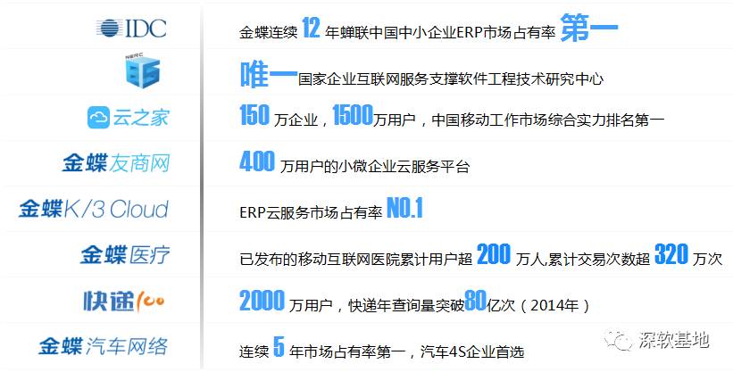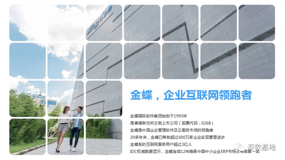 金蝶国际软件集团始创于1993年,是香港联交所主板上市公司(股票代码 : 0268)。是中国软件产业领导厂商、亚太地区企业管理软件及中间软件龙头企业,全球领先的在线管理及电子商务服务商。金蝶运用前沿科技,以管理信息化产品为核心,为超过600万家企业和单位提供云管理产品及服务,是中国软件市场的领跑者。到2016年,已有超过3000家合作伙伴选择金蝶作为共创共赢的发展平台。IDC权威数据显示,金蝶软件连续十二年位居中国中小企业市场占有率第一。财富中国100强企业,一半选择金蝶的软件产品。