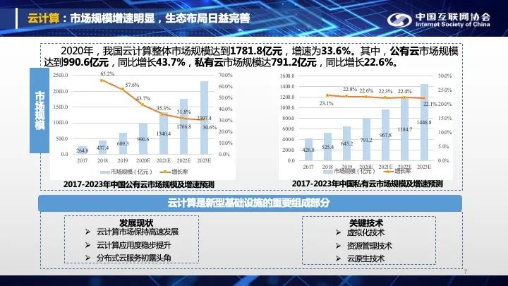 2020年云计算市场保持高速发展,整体市场规模达到了1781亿元,增速超过33%,其中公有云市场规模继续扩大,但增速放缓,预计到2030年将超过2000亿元。私有云的市场规模也同样持续扩大,增速平稳,去年达到了791.2亿元,同比增长22.6%。