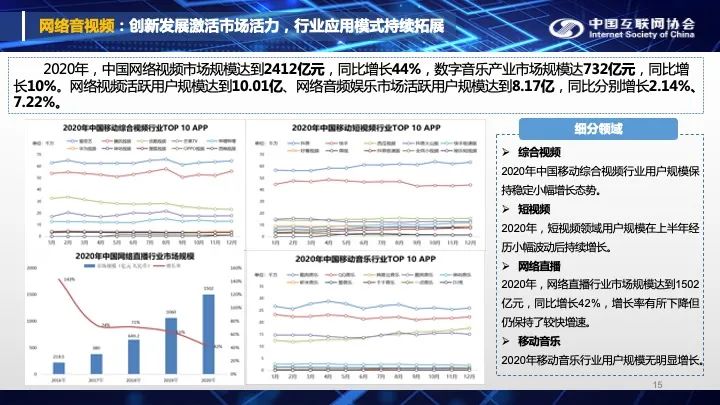 2020年中国互联网网络音视频规模达到了2412亿元,我国网络音视频用户规模持续增长。网络音视频市场依托技术升级、用户代际更替、消费模式转换等变量推动,产业效能持续提升,网络直播规模持续增长,技术和商业模式持续拓展。