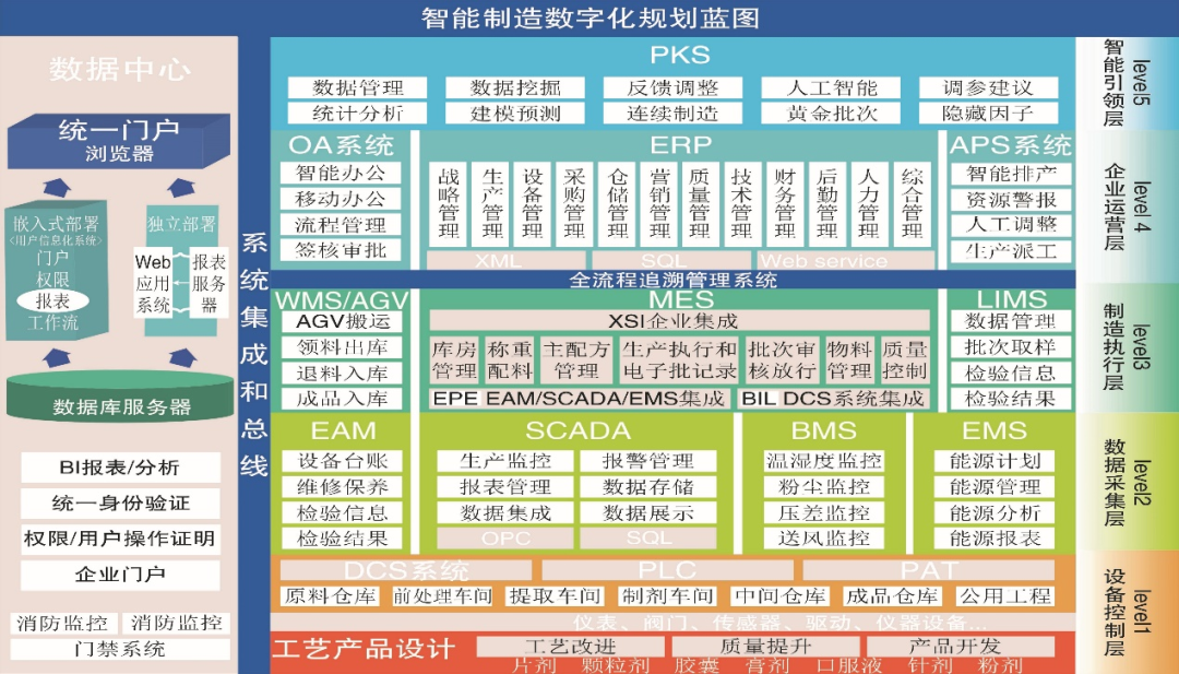 中药生产一体化解决方案,包括中药制药集散式控制系统(DCS)、在线质量检测系统(PAT)、制药企业数据采集与监控系统(SCADA)、中药生产制造执行系统(MES)、过程知识系统(PKS)等系统的定制化开发应用,并实现与生产装备、智能传感装备等硬件系统和企业资源计划(ERP)等系统的信息集成互通,实现中药全产业链智能制造。