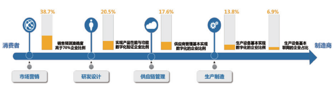 企业的数字化转型涉及从市场营销、产业研发、供应链管控到生产制造的各个业务环节。其中,靠近消费端的环节数字化转型基础好、起步早,数字化转型相对容易,销售预测准确度高于 70%的企业比例达 38.7%;而靠近制造端的环节受核心技术能力不足、数字化基础薄弱等因素制约,设备基本实现数字化的企业比例仅为13.8%,生产设备基本联网的企业比例仅为 6.9%,生产制造环节数字化成为企业实现全链路数字化的关键掣肘。