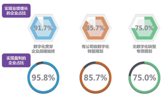数字化战略是企业数字化转型的核心前提和所有转型活动的顶层设计,为企业抢抓数字化发展先机、加速转型变革提供方向性、全局性的方略。以企业级数字化战略为指引,推进数字化转型,将大大提高转型效率、有效获取数字化效能。调查数据发现,将数字化贯穿战略始终的企业中,业绩增长和盈利的企业占比明显都要高于其他类型的企业。由此可见,有没有贯穿始终的数字化战略,将在很大程度上决定企业数字化转型的成败。