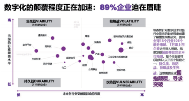 当然,这是一个漫长的过程,不同行业的数字化转型进程也不一样。埃森哲针对全球 18 个行业、106 个细分市场的 1 万家上市企业展开调研,发现 89%的企业数字化的颠覆程度正在加速,数字化转型迫在眉睫,但不同的行业受数字化转型的影响也会有明显差异。