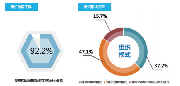 在数字化浪潮扑面而来的今天,企业如何实现以人为中心的智能的组织协同,推动企业数字化转型从局部优化走向全局优化,已经成为中国广大企业亟须跨过的门槛。中国企业积极拥抱移动互联网,推动组织工作管理模式在线化发展,目前已有92.2%的企业在组织管理和沟通协调过程中实现钉钉、企业微信、飞书等移动端组织协同工具使用,通过数字化工具应用提升企业内部的沟通协调和组织变革水平。