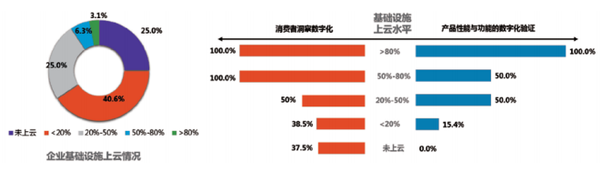 企业“上云”是企业提高创新能力、业务实力和发展水平的重要路径。在研发环节,企业基础设施上云可支撑企业基于数据精准洞察消费者需求并快速验证产品性能与功能,从而提升研发创新能力。调查数据显示,基础设施上云比例超过 80%的企业均可实现消费者洞察与产品验证的数字化,而未上云的企业均不能实现产品性能与功能的数字化验证,实现消费者洞察数字化的企业比例不到四成。