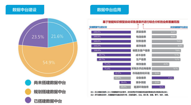 随着市场需求个性化、企业业务多元化、组织模式动态化、核心数据复杂化,数字中台概念应运而生。中台包含业务中台和数据中台,是为了满足不断变化的前台业务需求,将企业内部的数据、技术、业务沉淀出一套可方便调用的综合服务平台。已搭建数据中台的企业在生产、库存、销售、质量、物流、财务、成本、绩效等管理环节实现数据自动采集和智能分析的比例远高于未搭建数据中台的企业比例,数据中台为企业核心业务赋能作用显著。