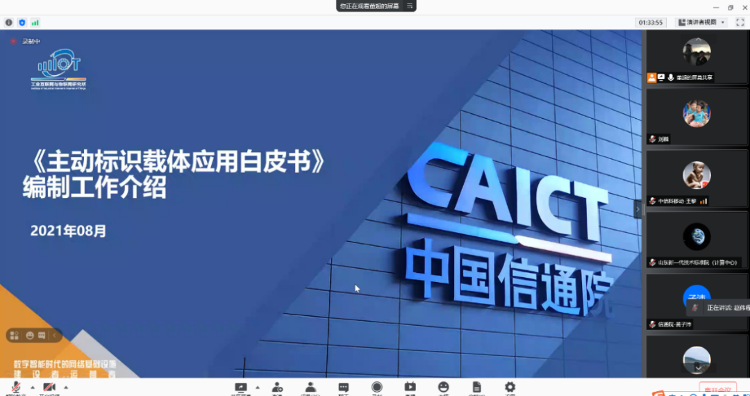 为贯彻落实工业和信息化部在《工业互联网创新发展行动计划(2021-2023年)》标识解析增强行动要求,加快主动标识载体规模化部署,推进工业设备和产品加标识,进一步提升我国标识解析体系的发展水平,中国信息通信研究院(以下简称“中国信通院”)组织编写《主动标识载体应用白皮书》,并于8月5日以线上会议的形式组织召开了“主动标识载体应用推进会暨《主动标识载体应用白皮书》编写工作会”,来自国内的相关工业企业、解决方案供应商、电信运营商、科研机构等30余家单位代表参加了会议。