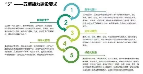 “5”为数字化设计、智能化生产、安全化管控、数字化管理、绿色化制造五项能力建设要求;