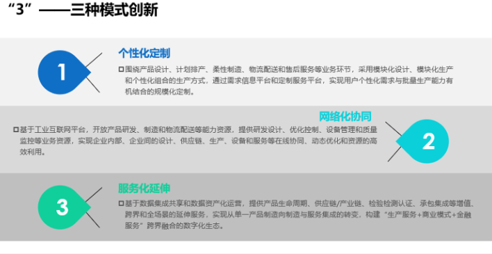 “3”为个性化定制、网络化协同、服务化延伸等模式创新;