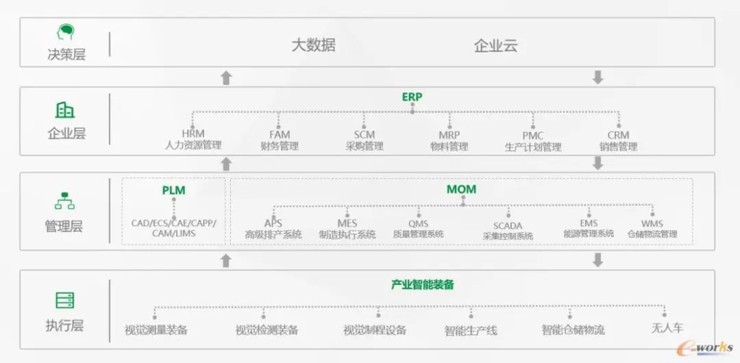 我认为,智能制造是通过新一代信息技术、自动化技术、工业软件及现代管理思想在制造企业全领域、全流程的系统应用而产生的一种全新的生产方式。在现代工业改革推进进程中,我们很难做到“自感知、自学习、自决策、自执行、自适应”,我们离真正意义上的智能工厂还差的有点远。经过多年的发展,我们已经能够从基础的自动化到信息化,再到现在的数字化。下文,我将详细的阐述数字化工厂的顶层管理架构。