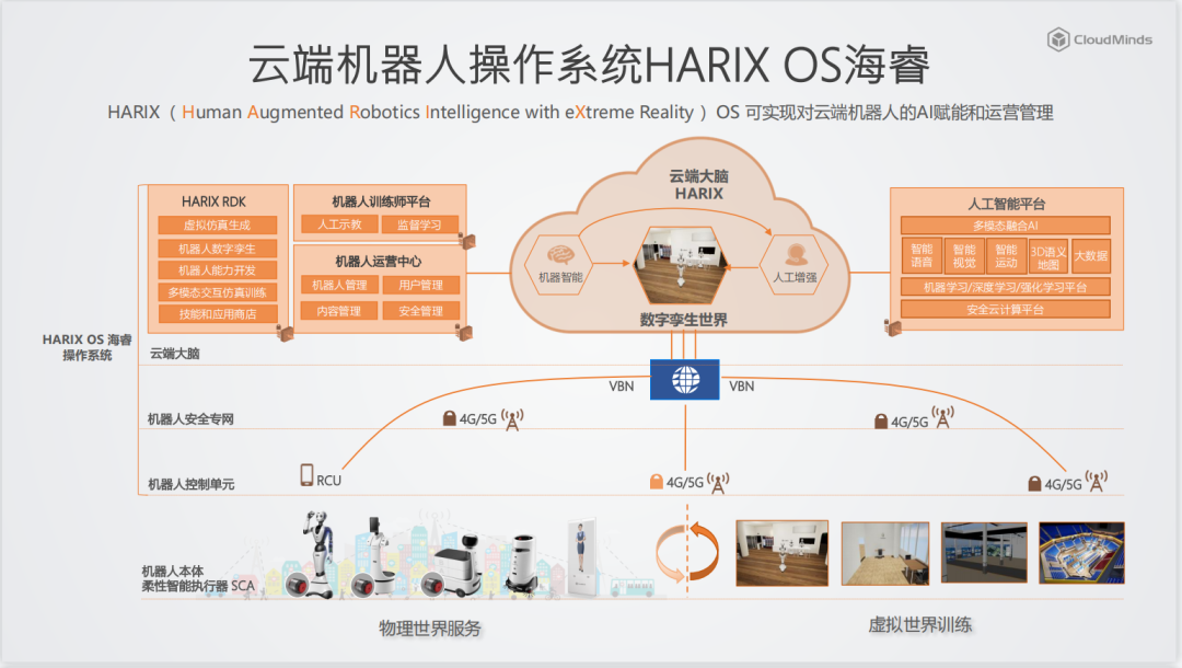 达闼在“云端机器人”架构基础上,独立自主研发并发布了继电脑Windows、手机Android和iOS之后,全球首个面向机器人的操作系统云端机器人操作系统 HARIX OS海睿。HARIX OS海睿,提供了一个基于虚拟孪生技术的机器人环境开发平台。搭载这一系统后,机器人不仅可以自主学习并进行智能进化,还可以借助“数字孪生”技术,对其未来的工作环境和内容建模,让同一类型的机器人在数字环境下大规模集中培训。