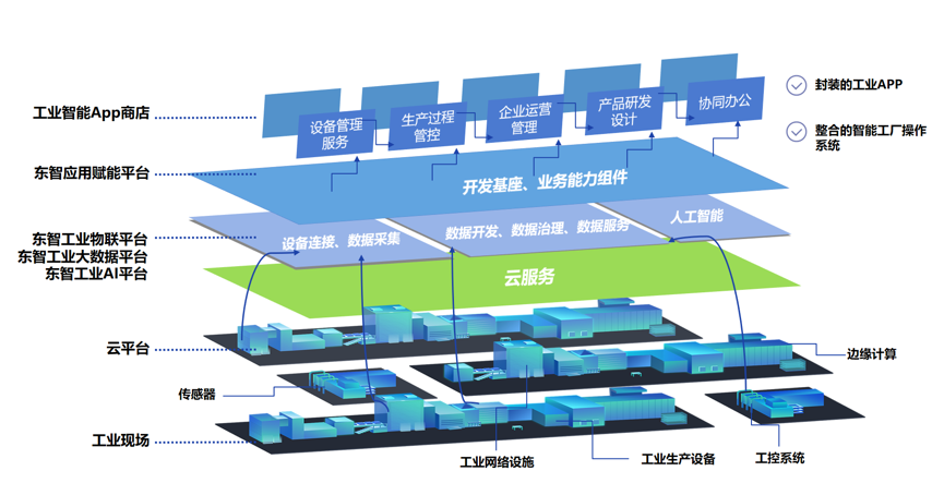东智智能工厂操作系统由四个核心平台——东智工业物联平台、东智工业大数据平台、东智AI平台、东智应用赋能平台以及工业智能APP商店组成的工业操作系统,致力于提供面向工业现场的一站式先进制造数字化解决方案,帮助用户快速构建设备健康管理、能源管理、品质提升、视觉检测等丰富的工业应用。
