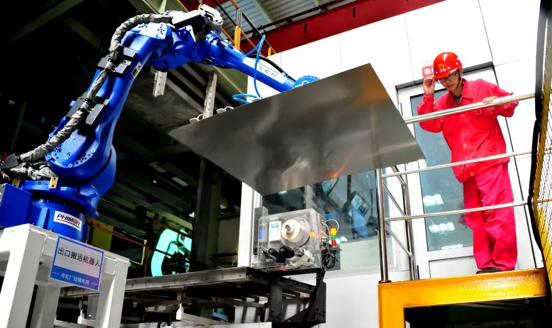 产线智能制造——“人机共舞”在沙钢集团冷轧厂硅钢车间,操作工黄亚娟正在电脑前对生产过程进行远程监控。“以前,钢板样本都是通过人工搬运的,现在机械手臂自动将钢板抓取搬运下来,完全解放了我们的双手,真是省力又安全。”黄亚娟表示。“机器工人”在取样、贴标、酸洗喷印等工段大显身手,安全又高效;设备点检不再需要人工记录,轻点手机便可完成数据传输,管理效率大大提升……目前,车间已经看不到工人们守着流水线忙碌的场景,取而代之的是机械手精准而快速的操作。车间内为数不多的员工主要负责设备维护,并对可能出现的突发状况进行应急处理。
