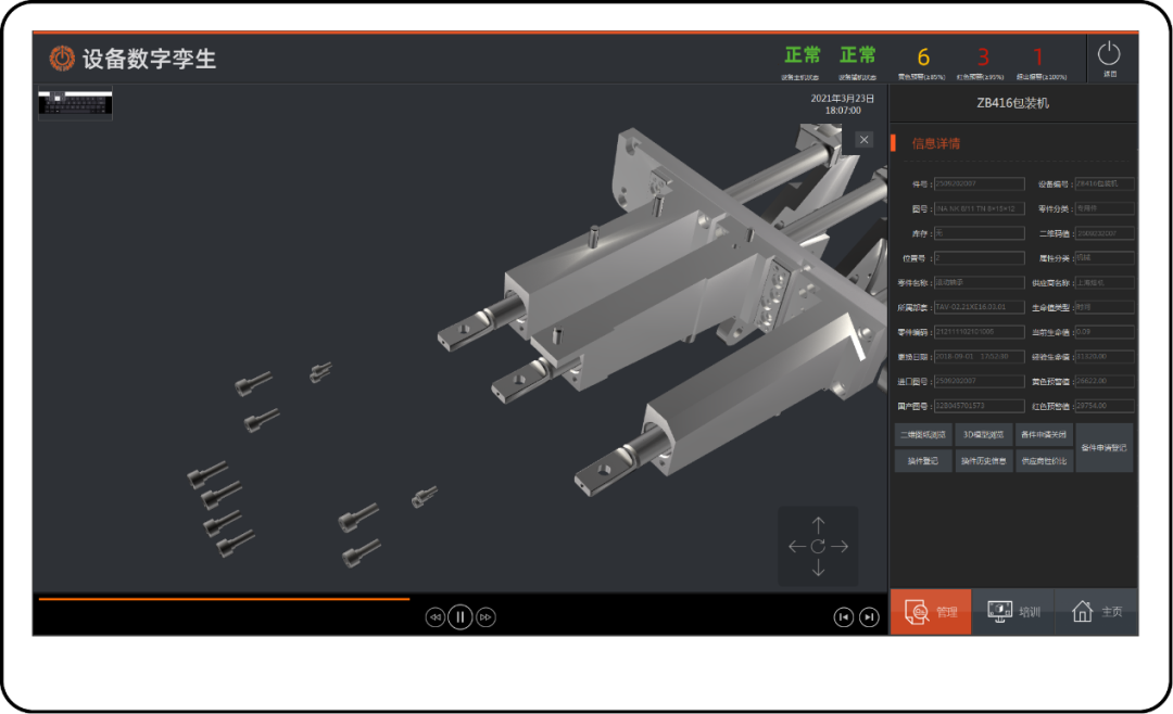 设备的元器件、油路、气路等,都是等比例建模,携带各种属性信息。设备数字孪生,就像为操作者提供了一台CT机,看到机器的各种结构和属性,从而对机器有着深刻的了解。