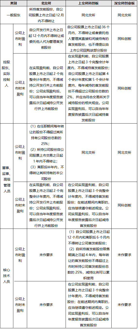 北交所、上交所科创板、深交所创业板针对首发前股份锁定期限对比如下(编者注:上市前一般股东,北交所不锁定)