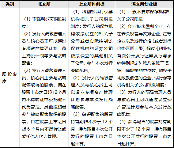 注册制下,北交所、上交所科创板和深交所创业板对于保荐机构相关子公司、发行人高级管理人员及核心员工跟投的具体要求如下: