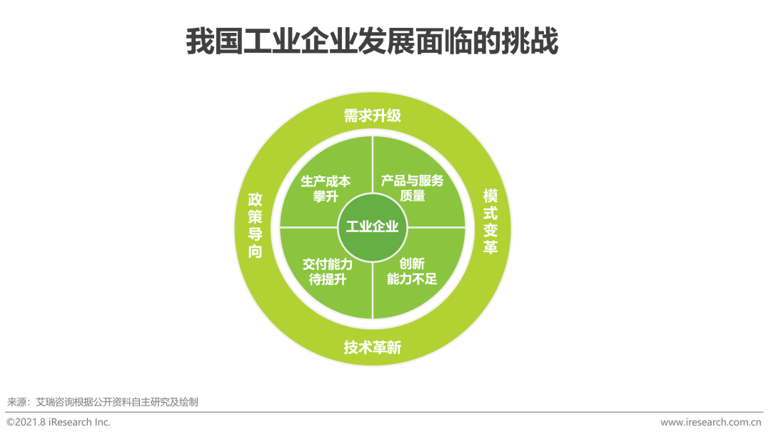 据统计我国中小企业占全部工业企业数量的90%以上,经过近三十多年的发展,中小企业已经成为我国国民经济和社会发展的重要力量,在繁荣经济、增加就业、推动创新、改善民生等方面发挥着越来越重要的作用。然而目前大部分工业互联网服务商还停留在如何服务好龙头企业的层面,忽视了数量更多的中小企业客户和其背后潜在的广阔市场空间。2021年政府工作报告指出,要发展工业互联网,搭建更多共性技术研发平台,提升中小微企业创新能力和专业化水平。共性技术即打造在多个领域内普适的,对产业发展起到根基作用的基础技术,突出通用性、关联性和系统性的特点,切实降低中小企业在创新发展上所需要的资金、时间、试错成本,进而为创新链和产业链相互促进奠定基础。可见我国发展工业互联网不仅仅要着眼于大企业向着更高层次的提升,还要兼顾中小企业信息化、数字化普及,只有推动面向中小企业的工业应用发展,才能真正引领我国工业互联网产业的繁荣。