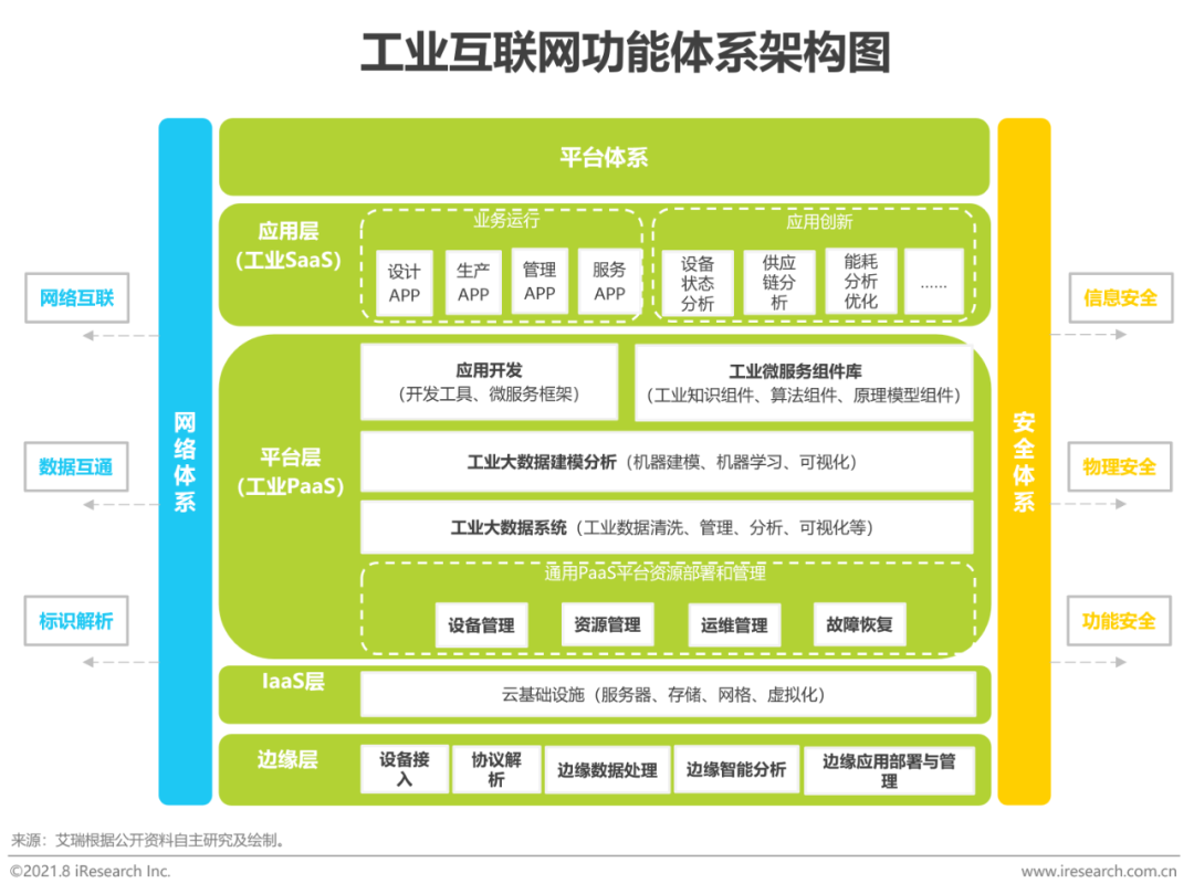 工业互联网由网络、平台、安全三大功能体系构成。工业互联网的网络体系将连接对象延伸到人、机器设备、工业产品和工业服务,是实现全产业链全价值链的资源要素互联互通的基础。网络性能需满足实际使用场景下低时延、高可靠、广覆盖的需求,既要保证高效率的数据传输,也要兼顾工业级的稳健性和可靠性;平台下连设备,上接应用,承载海量数据的汇聚,支撑建模分析和应用开发,定义了工业互联网的中枢功能层级,在驱动工业全要素、全产业链、全价值链深度互联,推动资源优化配置,促进生产制造体系和服务体系重塑中发挥着核心作用;安全代表着工业互联网的整体防护能力,涉及工业互联网领域各个环节,是涵盖设备安全、控制安全、网络安全、平台安全和数据安全的工业互联网多层次安全保障体系,通过监测预警、应急响应、检测评估、攻防测试等手段为工业互联网健康稳定的发展保驾护航。