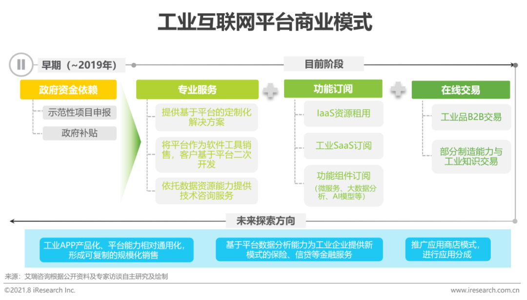作为国家战略级的新兴朝阳产业,工业互联网在网络、安全、设备改造等基础设施部署层面的商业模式较为清晰和传统,但产业核心的平台商业模式还在不断摸索与丰富,尚未形成定局。部分消费互联网平台经济模式也出现在了工业互联网之中,但后者To B/G企业服务的色彩相当浓重,传统工业场景的多元化和复杂性也决定了工业互联网平台的商业价值主要集中于个性化服务,整体上碎片化需求与规模化供给矛盾突出,未来向通用化、可复制的标准化产品和服务延伸仍将是行业拓展商业价值关键路径之一。